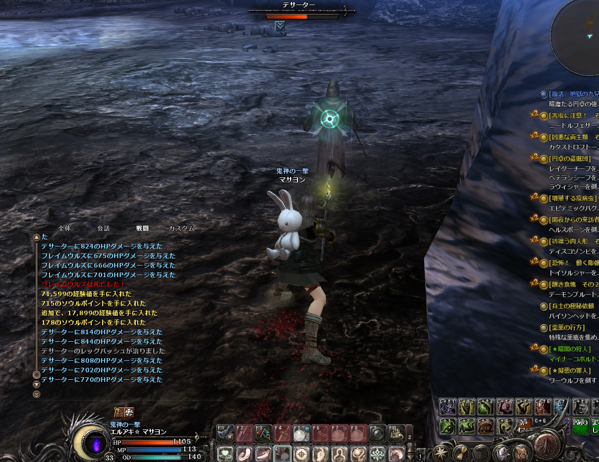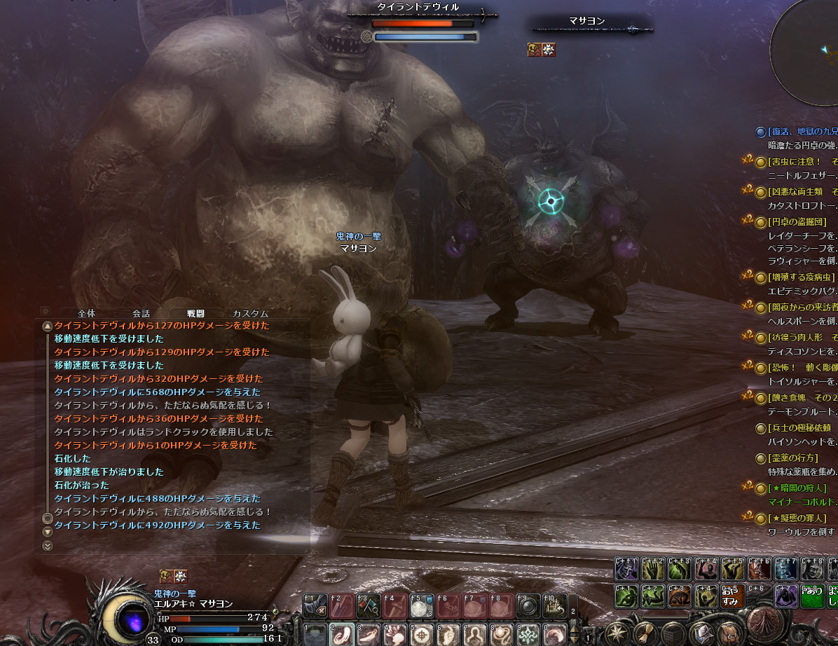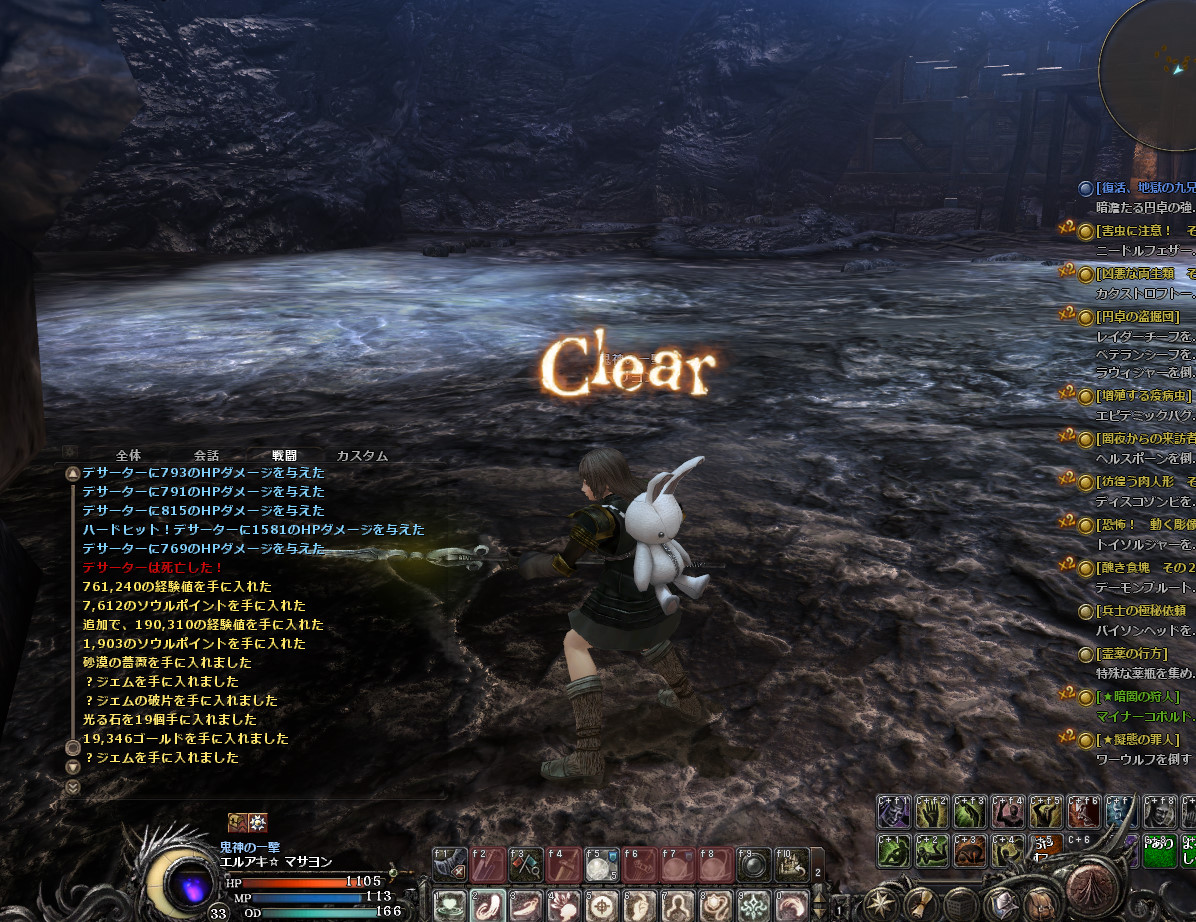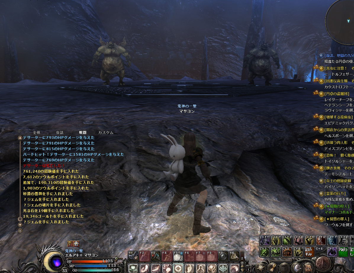 白い手前のほうが物理型でかなりHPが高い。奥の紫色が魔法型でどんどん魔法を撃ってくる。HPは低めっぽいけど、回復もしてくる?そしてwikiで調べたところ、同時に倒さないともう一方が復活してしまうらしい。こりゃつらい。ソロだともうちょっとレベル上げないと無理っぽいなー。ということで、ここらで退却。惜しかったね。