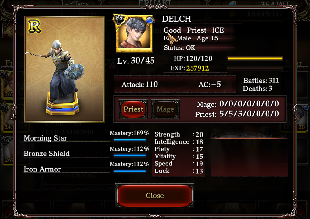 Pusy:サムライからビショップへ転職。普通のウィザードリィならありえない転職方法だけど、ウィズローグの場合は結構あり。サムライは一番HPが高い。ビショップはプリースト、メイジと同じくらいの呪文習得スピード。つまりサムライからビショップに転職することによってHPが高いビショップが作れる。属性がニュートラルなのでACが多少高くなるけど、後衛ならそんなに影響ないな。