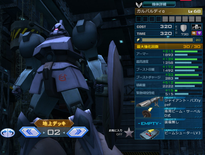 LV68。普通だなw ビルドアップキャンペーンなのに70に届かず。かわいそうな機体ガルバルディ。どこまでかわいそうなんだ!