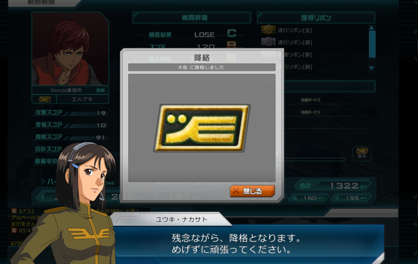 准将:大佐の上の階級。将官と呼ばれる階級。将官戦では准将~大将までが戦う。現在大将が最高の階級のため、最強のプレイヤーが集うのが将官戦である。つまり日本最強プレイヤーが集まるのが将官戦である。日本最強ということは世界最強プレイヤーの集まりである。世界最強ということは宇宙最強ということである。そしてあるものはニュータイプと呼ばれ、たった1機で何機もの敵を撃破し、一回の戦闘で500オーバーの点数をたたき出す一般兵から見ると化物ともおぼしきプレイヤーである。当然デッキに入っている機体はフルマスチケされたレベル70オーバーのリミットオーバー(オーバーしないが)機体ばかりである。そんなスーパー機体、スーパープレイヤーが集う戦い。それが将官戦である。准将になるということは、そんな戦いに身をおくことである。