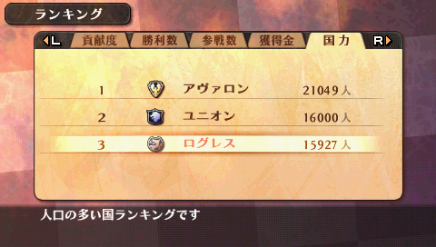 おお!?ログレスが一番人口が少ない。ログレスは少数精鋭部隊か。アヴァロン多いな(笑)