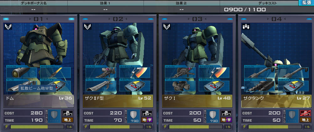 ザクIIF型は結構いいですよね。ブーストチャージが241まで伸びるので、ブーストチャージをあげておけば非常に使いやすいです。そうそう。ブーストチャージが高い機体は使いやすいということがわかった。オーバヒートしても回復が早い。ドムのブーストチャージはちょっといまいちだったりする。その辺もマイナスポイントか。