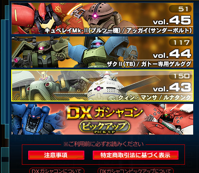 そして、最近のシステムになって、後から「あの機体の金図欲しいなー」と思っても、手に入れるすべが非常に少ないので、なかなか手に入らない。たとえば今、ガーベラテトラの金図欲しいけど、なかなか手に入らない。手に入れるためにはDXガシャコンピックアップでガーベラテトラが出たときにDXガシャコンを引きまくるしかないけど、100枚まわしても手に入るかどうか疑わしい状態です。狙ってガーベラテトラの金図を手に入れるのは非常に難しい。(コスト360以上の機体のGP落ちはいまだにないし。)