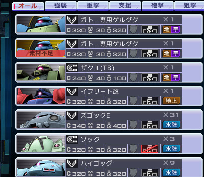 この中で欲しいのはザクII(TB)とアッガイ(サンダーボルト)。キュベレイマークIIも最近あまり見かけなくなったけどまあまあ欲しい。ザクII(TB)ってぜんぜん見ないな(;´・ω・)低コストで結構強いと思うんだけど。