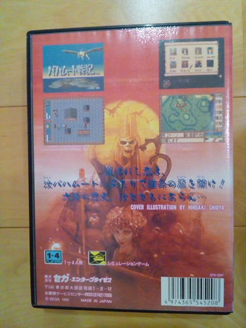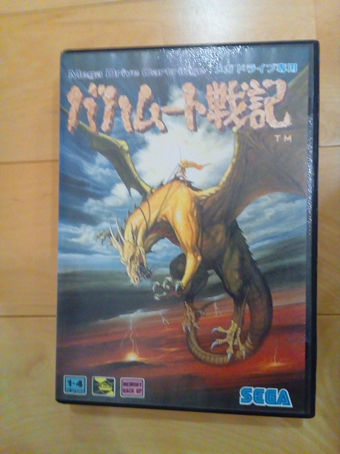 これは、当時、メガドライブを持っていた私がプレイしたいけど、なかなか手にする機会がなくて、買いそびれてしまったソフトです。で、ようやく最近アマゾンで1250円でゲット。メガドラ本体は無いので、プレイは出来ないのですが、箱や説明書を読んでニヤニヤするために買いました。にやにや、というか、いやーいいですねー。この箱。このメガドラのカッチリした箱といい、お気に入りの箱絵とか最高です。これを見ながらプレイすることを夢見たり、YouTubeでプレイ動画を見たりと、最近バハムート戦記ブームが来ております。