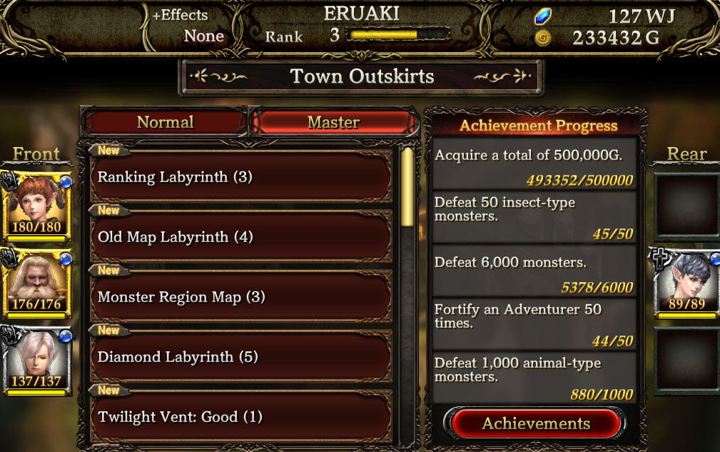 ダンジョン選択画面で、Normalがノーマルダンジョンで、ストーリーダンジョンみたいなもんなんだけど、Masterがいわゆるエクストラダンジョンで、今まで使ってなかったんだけど、このダンジョンを利用すれば経験値がたくさん、楽に稼げることがわかった。