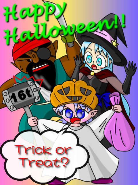 ぱぱぱぱんぷきーん!ハロウィンイラストですね!Marutaboさんのキャラがハロウィンにちなんだ仮装(コスプレ)をしているイラストですね。非常に愉快で楽しいイラストありがとうございました\(^o^)/