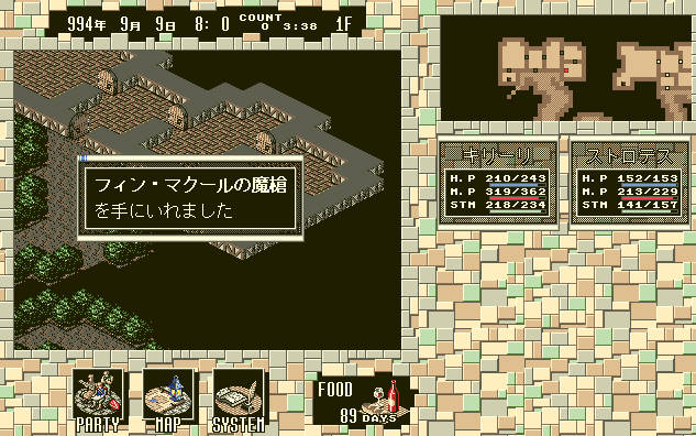 地下水道の最後のボスがこれまた強くてかなり死ねます。3回死んだところで、パーティに誘われて3人パーティでアタック。自分がファイターで、シーフとプリーストさんが加わって3人パーティ。やっぱりプリーストがパーティにいるといいですね!HPが減ると回復してくれる(笑)