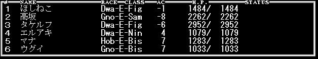 まずエルアキ(忍者)に手裏剣を装備させて後ろにまわり、マナ(僧侶)を前衛にもってきて、それなりにいい武器でなぐります。これで直接攻撃は多少補うことができました。