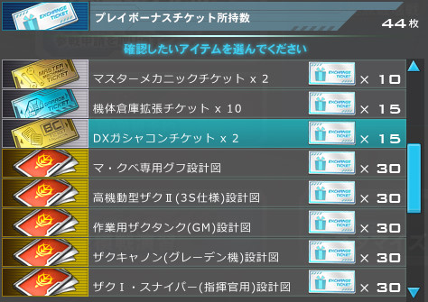 そんなこんなで、プレイチケットで何と交換しようかと考えてみたけど、機体との交換はやめようかな。