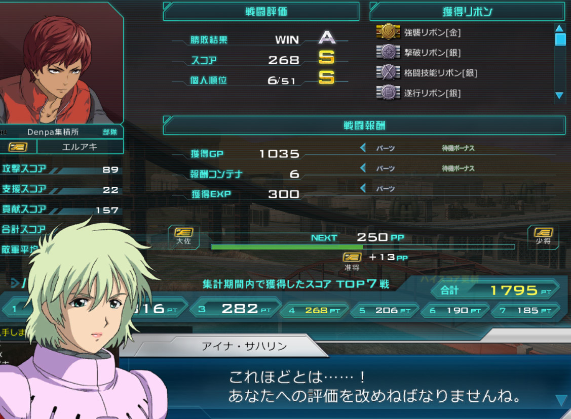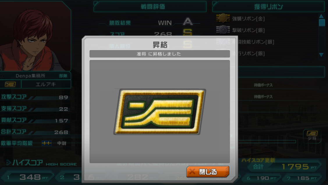 准将:大佐の上の階級。将官と呼ばれる階級。将官戦では准将~大将までが戦う。現在大将が最高の階級のため、最強のプレイヤーが集うのが将官戦である。つまり日本最強プレイヤーが集まるのが将官戦である。日本最強ということは世界最強プレイヤーの集まりである。世界最強ということは宇宙最強ということである。そしてあるものはニュータイプと呼ばれ、たった1機で何機もの敵を撃破し、一回の戦闘で500オーバーの点数をたたき出す一般兵から見ると化物ともおぼしきプレイヤーである。当然デッキに入っている機体はフルマスチケされたレベル70オーバーのリミットオーバー(オーバーしないが)機体ばかりである。そんなスーパー機体、スーパープレイヤーが集う戦い。それが将官戦である。准将になるということは、そんな戦いに身をおくことである。