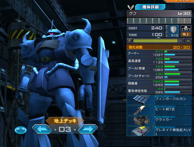 こんな感じで軽めの装備にすれば機体バランス61以上も確保できるので、軽くて丈夫なグフは良い機体だ。