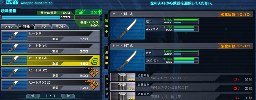 ヒート剣は使いやすいT型。D型は前に飛びすぎる感があるので、T型。この接近戦攻撃が意外と範囲が広くて使いやすい。「はずれたか?」と思ったら当たってた。なんていうラッキーなこともあったりして結構使いやすい。強襲機で接近戦攻撃が使いやすい=使いやすい機体 ですよね。