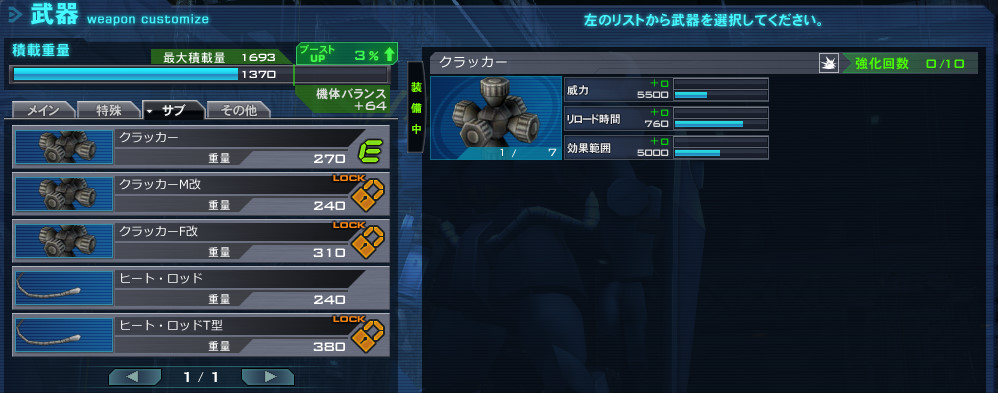 うーん、ちょっといまいちなんだよなぁ。悪くは無い。でも良くも無い?いや、でも決して悪い機体じゃない。でもコスト300はちょっと重い。これでコスト280なら最高だったよねー。でも機体の硬さからいうとやっぱり300かな。シールドもあるし、ブーストチャージも高め。(これもあくまで高めであって、高く無い。イフリートの初期値は260。高い。)ブースト容量もかなり高い。
