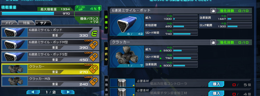 サブ武器は6連装ミサイル・ポッド。悪くは無いが良くも無い。威力1000の弾が6発発射。中距離の牽制にはいいかな。クラッカーにしたほうが重量的には軽いけど、クラッカーにしてしまうと、ほぼメイン武器だけで戦わなくてはいけなくなるわけで・・・。それはちょっときつい気がする。