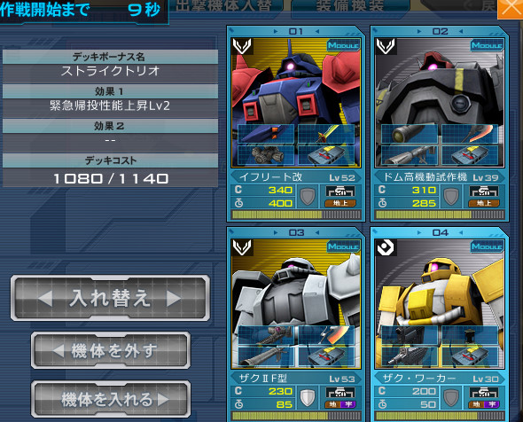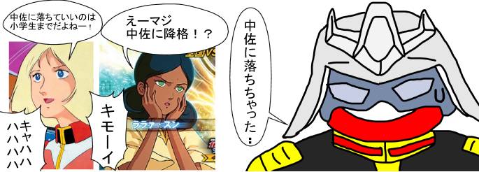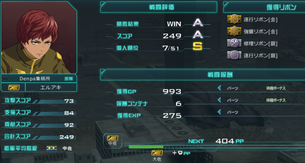 ということを踏まえて、今はどの能力を伸ばそうか考え中。とりあえず緊急帰投性能は最低ラインの400まで伸ばして、次は積載量を伸ばしていこうかと考え中。最近機体バランスって大事だなーっと思ってきて。高機動ドムが良くこけるんですよw で、ああいう敵と目の前で戦う機体はこけたら結構終わる。こけるとすかさず追撃食らって終わりますからね。まあ、こちらもこけた相手を見逃さず追加攻撃しますがw なので、強襲機体にとって転ばないことって結構重要。また、積載量を増やすことによってブーストも伸びるので、今までは「積載量って一番いらないよなー」なんて思っていましたが、実はこれ結構重要だね、と思ってきましたよ。積載量→ブーストチャージ→ブースト容量or最高速度かな。アーマーを上げる余裕が無い。アーマーも1679まで上がるんですけどねぇ~。